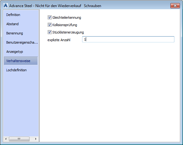 Auf dieser Registerkarte des Dialogfelds Eigenschaften können Sie das Verhalten von Schrauben bei Kollisionsprüfung und Positionierung auswählen.
