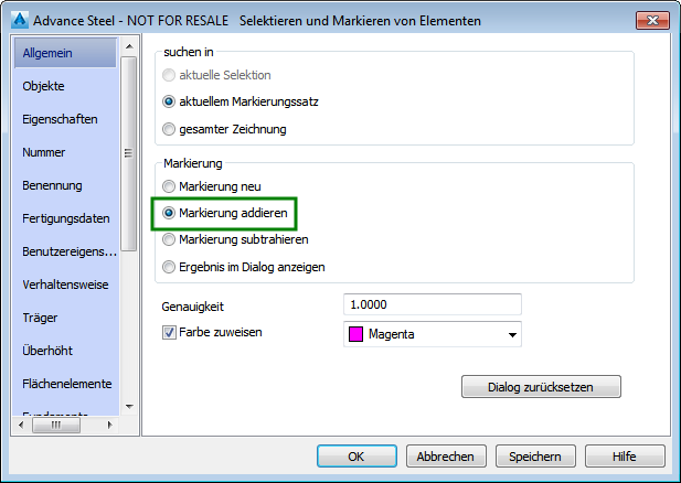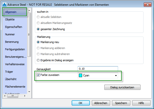 Damit Sie die Funktion für die farbige Markierung in einem Projekt verwenden können, müssen Sie das Dialogfeld Selektieren und Markieren von Elementen aufrufen. Hierfür haben Sie zwei Möglichkeiten:Das Dialogfeld Selektieren und Markieren von Elementen wird angezeigt. Aktivieren Sie auf der Registerkarte Allgemein das Kontrollkästchen Farbe zuweisen, und wählen Sie die gewünschte Farbe für Ihre Abfrage aus dem Dropdown-Menü.