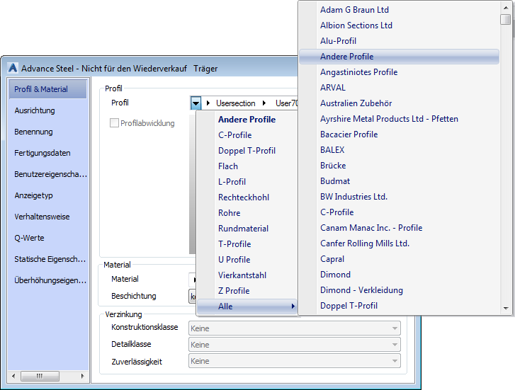 (Profilname). Der Text für den Namen der Profilreihe wird im Dialogfeld Advance Eigenschaften auf der Registerkarte Profil und Material angezeigt.