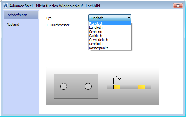 Wählen Sie den Lochtyp für das ausgewählte Element aus. Im Dialogfeld werden die Parameter für den ausgewählten Lochtyp angezeigt.