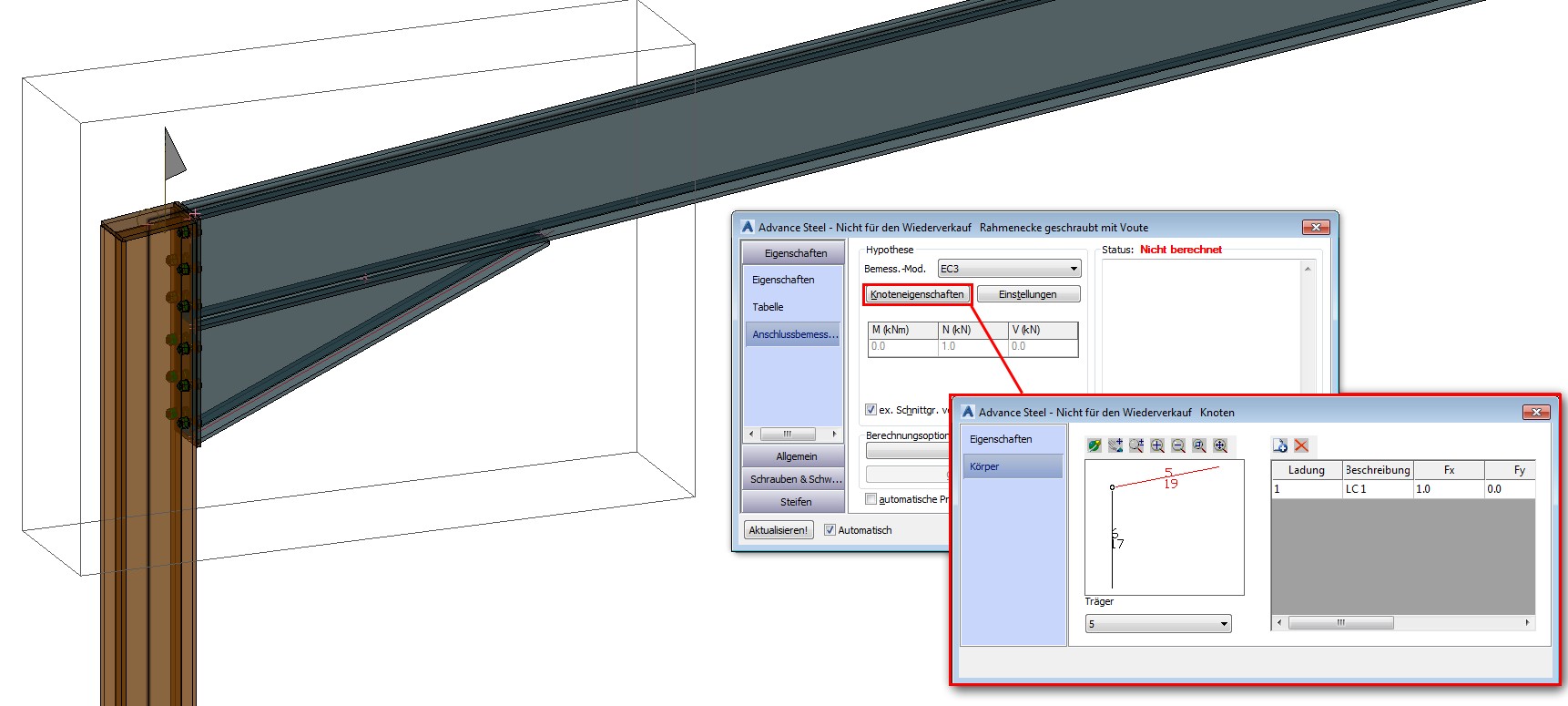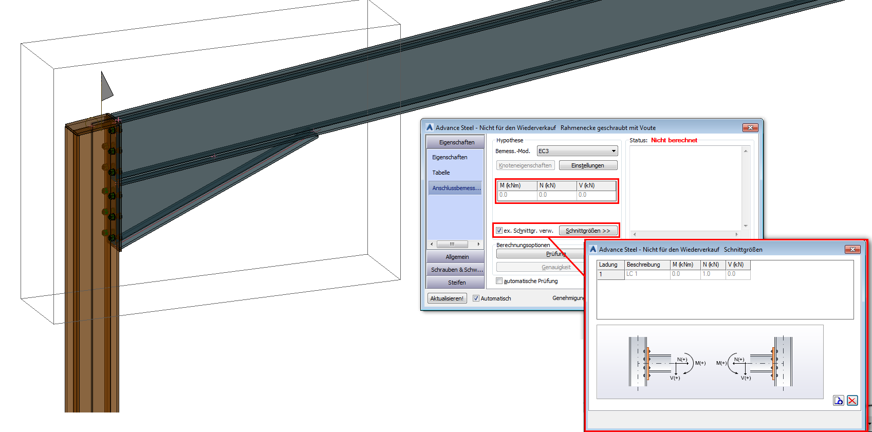Wenn Sie eine Stahlverbindung zwischen Elementen platzieren, die sich innerhalb eines analytischen Knotens befinden, können Sie die Kraft- und Momentwerte im Dialogfeld Anschlussbemessung importieren und die Berechnung unter Verwendung dieser Werte durchführen. Dazu müssen Sie das Kontrollkästchen vor der Option ex. Schnittgr. verw. aktivieren. Durch Klicken auf die Schaltfläche Schnittgrößen wird ein Dialogfeld mit allen aus dem analytischen Knoten übertragenen Lastfällen (Kräften und Momenten) angezeigt.