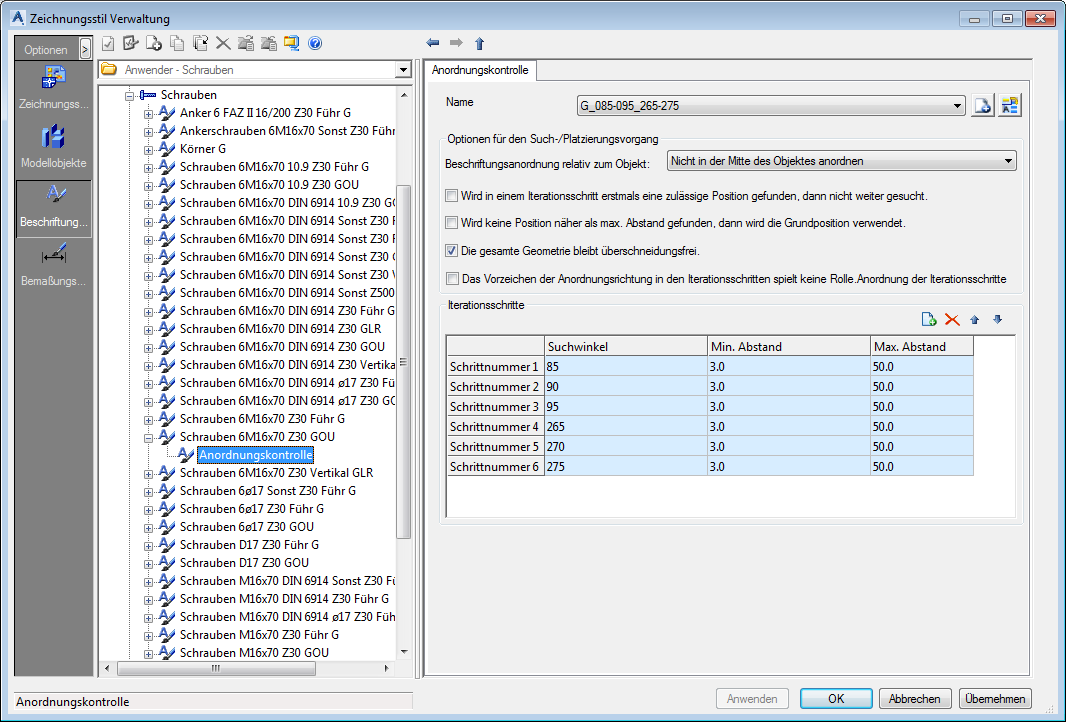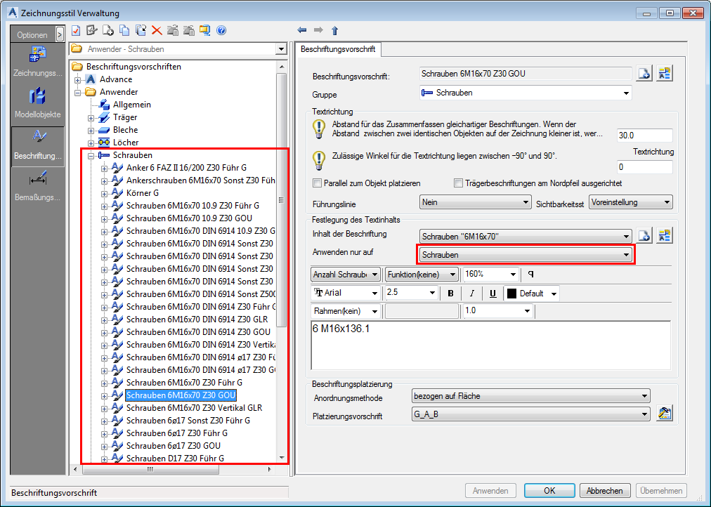 Mit der Option Für Objekte verwendet wird angegeben, für welche Modellobjekte die Definition gilt. Diese Einstellung wirkt sich auf die Auswahl des Beschriftungsstils in der Strukturdarstellung nach Öffnen eines Zeichnungsstils aus.