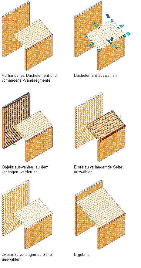 Gehen Sie wie folgt vor, um eine Decke oder ein Dachelement bis zu einer Ebene zu erweitern, die durch eine andere Decke, ein anderes Dachelement oder eine andere Wand definiert wird. Das Zielobjekt selbst muss die erweiterte Decke oder das erweiterte Dachelement nicht notwendigerweise schneiden, es muss jedoch eine Schnittmenge mit dem aktuellen Benutzerkoordinatensystem (BKS) vorhanden sein.