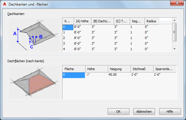 | Entfernen einer Dachfläche | Wählen Sie die entsprechende Nummer aus der Spalte Fläche, und drücken Sie ENTF. |