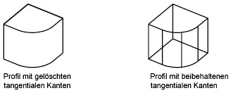 Legt fest, ob tangentiale Kanten angezeigt werden. Eine tangentiale Kante entspricht der Übergangslinie zwischen zwei tangentialen Flächen. Dies ist die imaginäre Kante, an der zwei Flächen tangential aufeinandertreffen. Beim Abrunden des Randes eines Feldes werden tangentiale Kanten erstellt, bei denen sich die zylindrische Fläche der Abrundung mit den ebenen Flächen des Feldes mischt. Tangentiale Kanten werden in den meisten Zeichenprogrammen nicht angezeigt.