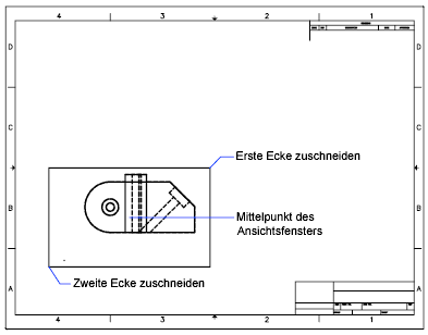 An der nächsten Eingabeaufforderung werden Sie aufgefordert, den Mittelpunkt des neuen Ansichtsfensters festzulegen. Wenn Sie den Vorgabewert akzeptieren (durch Drücken der EINGABETASTE), wird eine lotrecht zur Schnittebene verlaufende Gummibandlinie angezeigt und somit die Bestimmung der Mitte erleichtert. Ansonsten können Sie die Ansicht an eine beliebige Stelle platzieren.