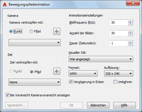 Verknüpft eine Kamera mit einem Bewegungspfad in der Zeichnung. Bei dem Pfad kann es sich um eine Linie, einen Bogen, einen elliptischen Bogen, einen Kreis, eine Polylinie, eine 3D-Polylinie oder einen Spline handeln.