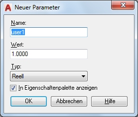 Dient zum Erstellen und Definieren neuer Benutzerparameter, die zur Blockeigenschaftentabelle hinzugefügt werden.