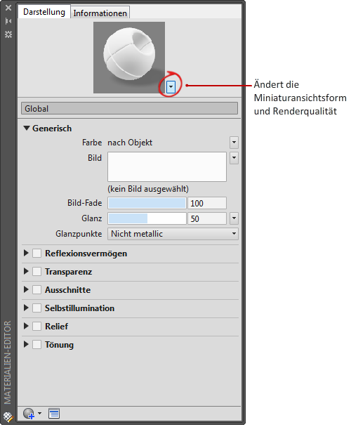 Bearbeiten Sie ein vorhandenes Material (aus der Autodesk-Materialbibliothek), oder beginnen Sie mit einem allgemeinen Material. Die Änderungen werden in der Voransicht des Materialmusters angezeigt. Sie können die Form des Bildes ändern, das in der Voransicht angezeigt wird.