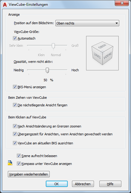 - Zeigen Sie das Dialogfeld ViewCube-Einstellungen an.