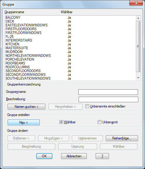 Erstellt anhand der ausgewählten Objekte eine neue Gruppe. Dabei werden der Name und die Beschreibung unter Gruppenname und Beschreibung verwendet.