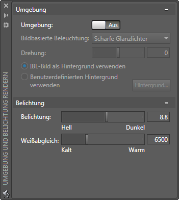 Legt die Verwendung der bildbasierten Beleuchtung fest und steuert die Belichtungseinstellungen, die beim Rendern angewendet werden sollen.