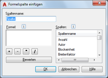 Zeigt die Spaltennamen der extrahierten Zeichnungsdaten und der externen Daten an (sofern eine Datenverknüpfung erstellt wurde). Spaltennamen können zum Feld Formel hinzugefügt werden, indem Sie auf den entsprechenden Namen doppelklicken. Alternativ können sie von der Liste Spalte auf das Feld Formel gezogen werden. Vorhandene Formelspalten werden nicht angezeigt und können nicht als Werte zum Erstellen weiterer Formelspalten verwendet werden.