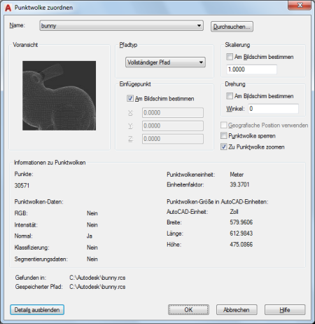 So fügen Sie einer Zeichnung ein Punktwolkenprojekt oder eine Scan-Datei hinzu, um damit arbeiten zu können.