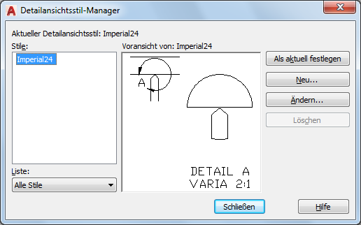 Zeigt eine Liste der Detailansichtsstile an, die in der aktuellen Zeichnungsdatei verfügbar sind. Der aktuelle Stil wird hervorgehoben.