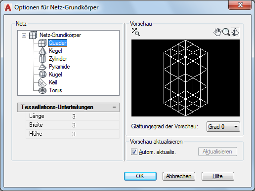 Gibt den zu ändernden Netz-Grundkörper an. Wählen Sie einen Grundkörpertyp (z.B. Quader oder Kegel) aus, dessen Einstellungen Sie unter Tessellationsunterteilungen anzeigen möchten.