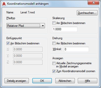 Gibt an, wie die Koordinationsmodelldatei gefunden und geladen wird: vollständiger (absoluter) Pfad, relativer Pfad(bezogen auf die übergeordnete Zeichnung), kein Pfad (Datei befindet sich im selben Ordner wie die übergeordnete Zeichnung).