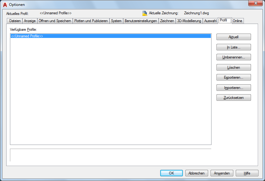 Löscht das ausgewählte Profil (nicht möglich, wenn Sie das aktuelle Profil ausgewählt haben).