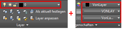 Verwenden Sie auf der Registerkarte Start der Multifunktionsleiste die Gruppen Layer und Eigenschaften, um die Einstellungen für die Einstellungen zu prüfen oder zu ändern, die am häufigsten verwendet werden: Layer, Farbe, Linienstärke und Linientyp.