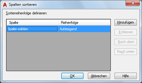 Definiert die Sortierreihenfolge für Spalten. Der Abschnitt Spalte enthält die Spaltennamen der Seite Daten verfeinern.