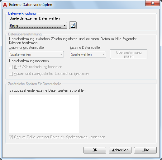 Vergleicht die Daten der Datenschlüsselspalte in der angegebenen Zeichnung mit den Daten der externen Datenschlüsselspalte. Wenn die Daten aller Zeilen der externen Datenschlüsselspalten eindeutig sind und mindestens eine Übereinstimmung zwischen den Zeichnungsdaten und den Daten in der Tabelle gefunden wurde, wird eine Meldung angezeigt, die eine erfolgreiche Prüfung des Schlüssels bestätigt. Sollte die Prüfung des Schlüssels nicht erfolgreich durchgeführt worden sein, wird eine entsprechende Warnmeldung ausgegeben.