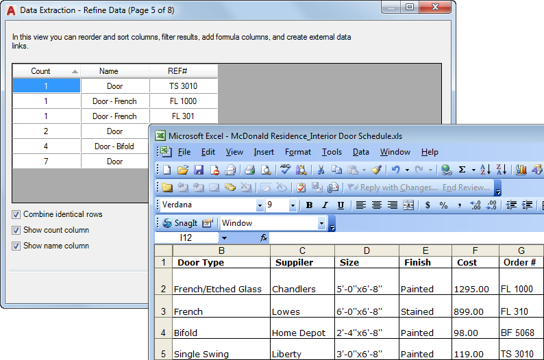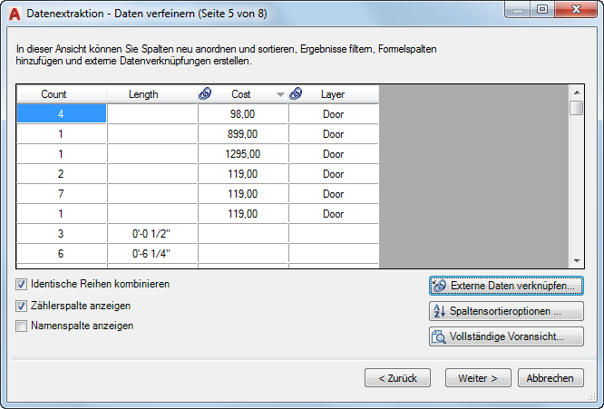 Die in einer Excel-Tabellenkalkulation gespeicherten Informationen können verknüpft und mit den extrahierten Zeichnungsdaten (Objekteigenschaftsdaten) kombiniert werden. Fahren wir mit demselben Beispiel fort: Sie haben zusätzliche Informationen über die Türen in Ihrer Zeichnung in einer Excel-Tabelle abgelegt (Lieferant und Kosten). Sie wählen die Spalten für Lieferant und Kosten in der Tabelle und kombinieren sie mit den anderen Daten in der Datenextraktion.