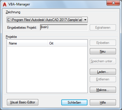 Zeigt den Visual Basic-Editor an, in dem Sie Code, Formulare und Referenzen für jedes geladene VBA-Projekt oder jedes eingebettete VBA-Projekt in einer geöffneten Zeichnung bearbeiten können. Darüber hinaus können Sie Projekte aus dem Visual Basic Editor heraus testen und starten.