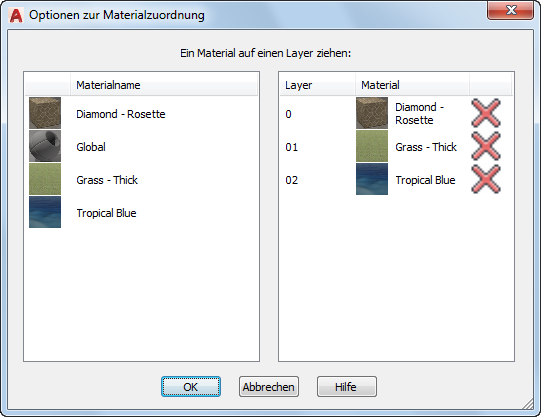 Listet alle Layer in der Zeichnung und in allen externen Referenzen auf, die der Zeichnung zugeordnet wurden. Die Miniaturansicht des Materials zeigt, welches Material dem Layer zugewiesen worden ist. Mit der Lösen-Schaltfläche (das X) heben Sie die Materialzuweisung zu dem Layer auf.