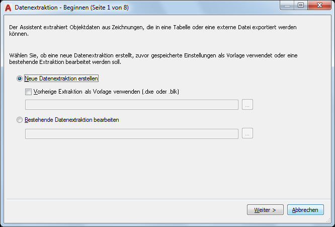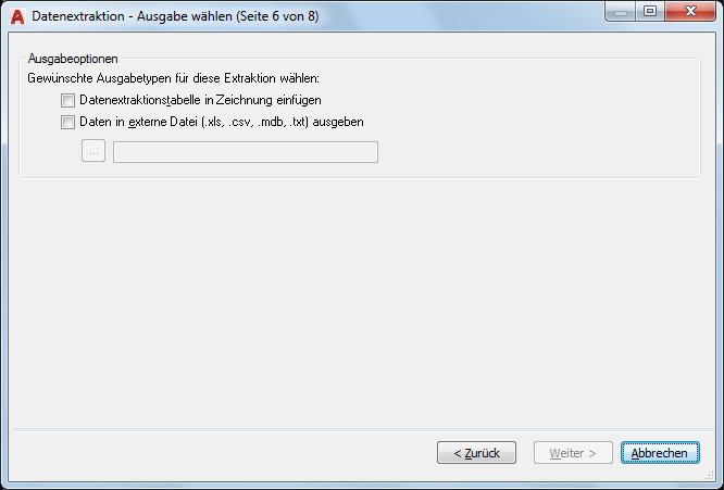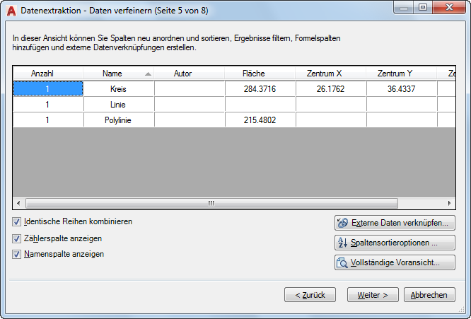 Anhand dieser Informationen wird in der aktuellen Zeichnung und/oder in einer externen Datei eine Datenextraktionstabelle erstellt.
