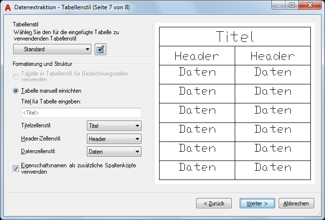 Steuert das Erscheinungsbild der Datenextraktionstabelle. Diese Seite wird nur angezeigt, wenn Sie auf der Seite Ausgabe wählen die Option AutoCAD-Tabelle ausgewählt haben.