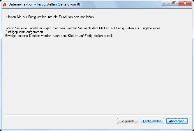 Erstellt eine Tabelle, die die extrahierten Daten enthält. Sie werden aufgefordert, die Tabelle in die aktuelle Zeichnung einzufügen, wenn Sie auf der Seite Fertig stellen auf Fertig stellen klicken.