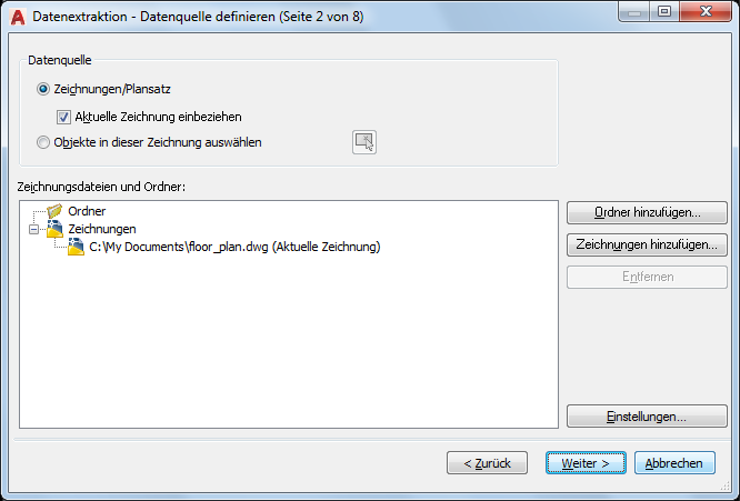 Gibt die Zeichnungsdateien und Ordner an, aus denen Informationen extrahiert werden sollen. Ermöglicht die Auswahl von Objekten in der aktuellen Zeichnung, aus der Informationen extrahiert werden sollen.