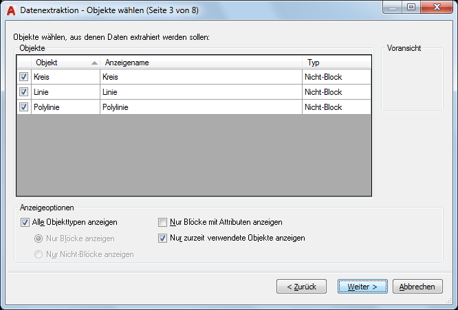 Gibt die zu extrahierenden Objekttypen (Blöcke und Nicht-Blöcke) und Informationen zur Zeichnung an.
