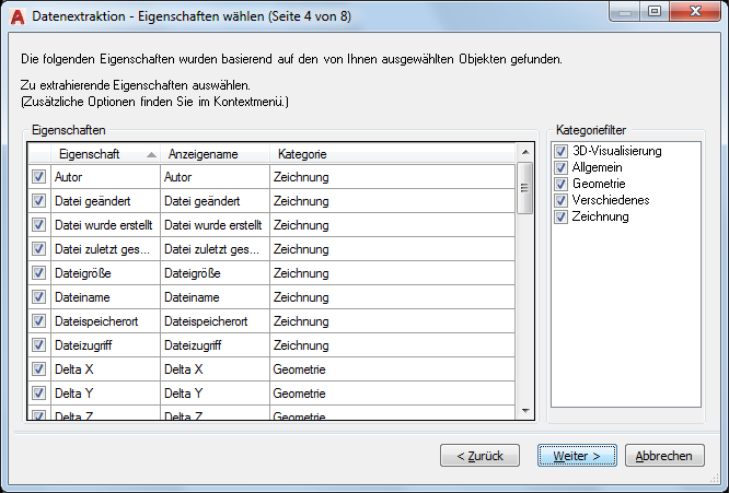 Steuert die zu extrahierenden Objekt-, Block- und Zeichnungseigenschaften.