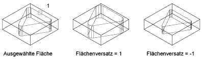 Versetzt Flächen gleichmäßig um einen angegebenen Abstand oder durch einen bestimmten Punkt. Bei positiven Werten wird Größe oder Volumen des Volumenkörpers erhöht Bei negativen Werten wird Größe oder Volumen des Volumenkörpers verringert.