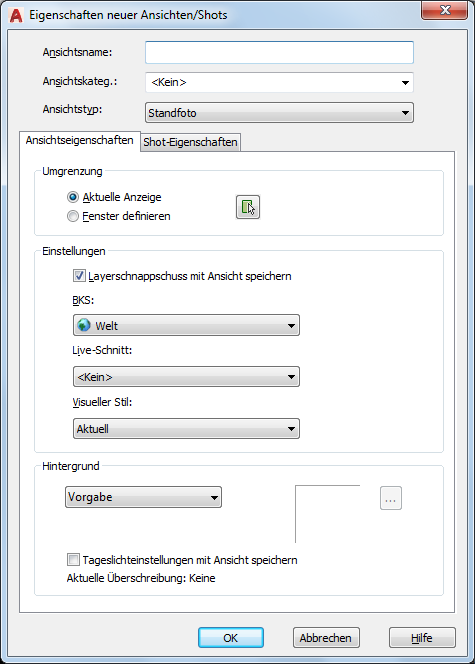 Dialogfeld Eigenschaften neuer Ansichten/Shots