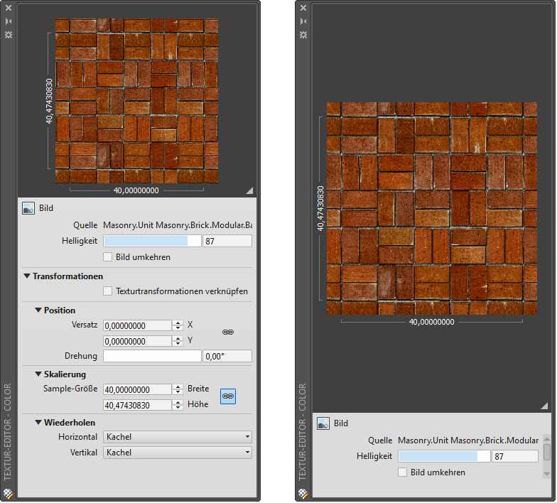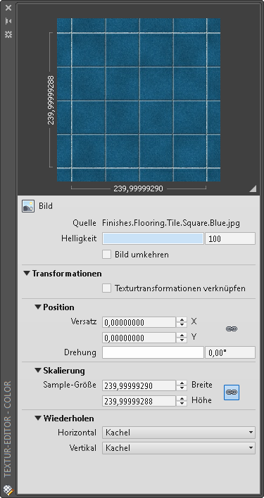 Wenn Sie die Änderungen der Eigenschaften für Position, Skalierung und Wiederholen, die Sie an der aktuellen Textur vornehmen, auf andere Texturen in demselben Material anwenden möchten, wählen Sie die Option Textur-Transformationen verknüpfen.