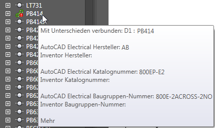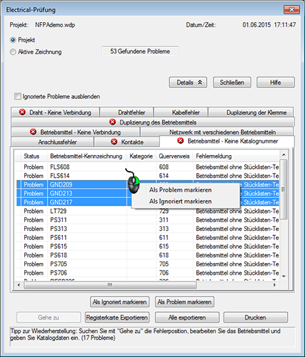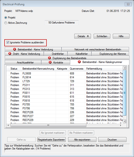 Der Fehlerstatus wird beibehalten, wenn Sie die Prüfung erneut durchführen, und auch über mehrere Sitzungen von AutoCAD Electrical gespeichert.