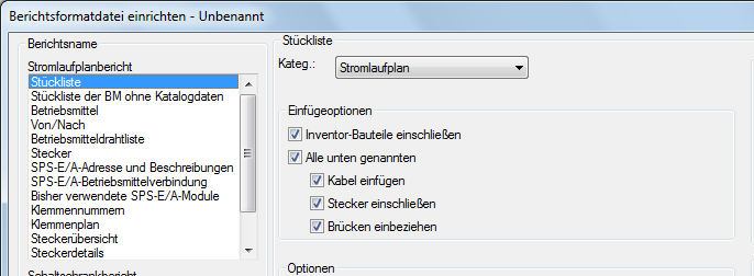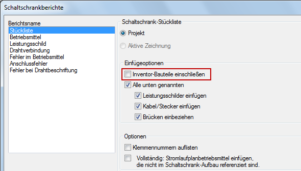 Die Option zum Einschließen von Inventor-Bauteilen wird auch unter Berichtsformatdatei einrichten für Schaltschrank- und Stromlaufplan-Stücklistenberichte hinzugefügt.