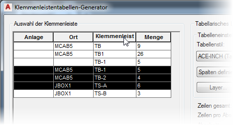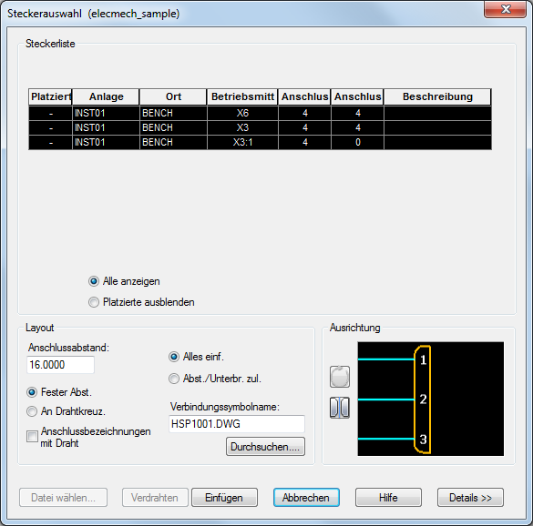 Dadurch wird das Dialogfeld Steckerauswahl geöffnet, in dem Sie die Stecker basierend auf den Inventor-Daten einfügen und verdrahten können.