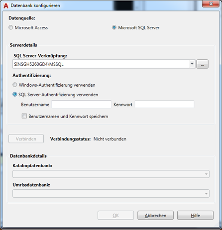 Im eigenständigen Modus können Sie Ihren SQL Server aus dem Produkt heraus konfigurieren. Verwenden Sie den Befehl AECATALOGCONFIG zum Öffnen des Dialogfelds Datenbank konfigurieren. Hier können Sie eine Verbindung zur SQL Server-Instanz herstellen und dann die Katalog- und Umrissdatenbanken auswählen.