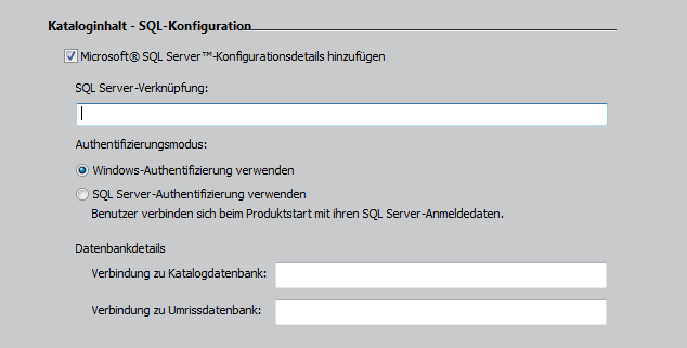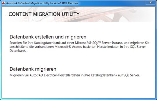Im Einrichtungsmodus können Sie eine Verbindung mit Ihrer SQL Server-Instanz herstellen, die bereits von Ihrem Datenbank-/Systemadministrator erstellt wurde. Zum Erstellen einer SQL Server-Instanz verwenden Sie die Autodesk Content Migration Utility for AutoCAD Electrical. Hierbei handelt es sich um ein Werkzeug, mit Sie die Datenbank aus Microsoft® Access erstellen und in Microsoft® SQL™ Server migrieren können.