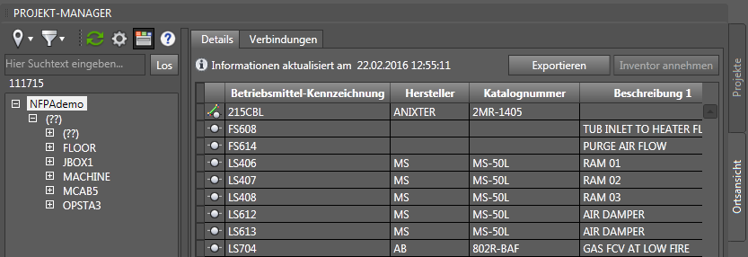 Bei der Arbeit in einem elektromechanischen Projekt können Sie jetzt die AutoCAD Electrical-Betriebsmittel direkt auf der Registerkarte Ortsansicht des Projektmanagers mit dem Inventor-Bauteil verknüpfen.