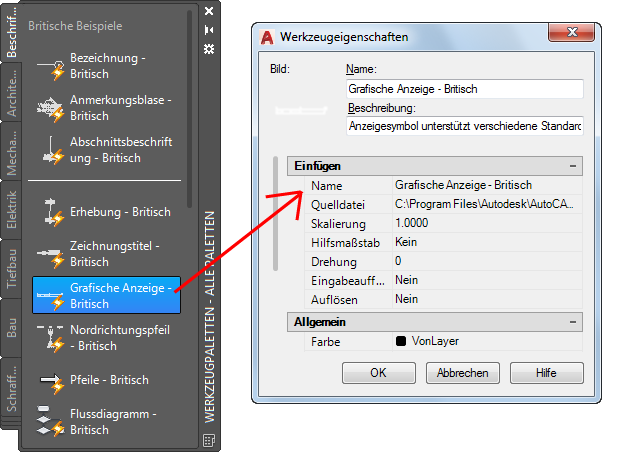 Sobald sich ein Werkzeug auf einer Werkzeugpalette befindet, können Sie seine Eigenschaften ändern. Sie können beispielsweise die Einfügeskalierung eines Blocks oder den Winkel eines Schraffurmusters ändern.