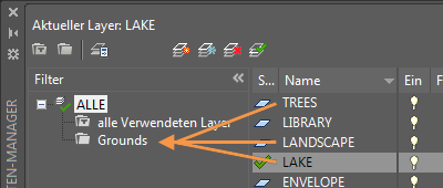 In diesem Beispiel erstelle ich einen Layergruppenfilter namens "Grounds" und ziehe die Layer TREES, LANDSCAPE und LAKE für Bäume, Landschaft und See in den Gruppenfilter.