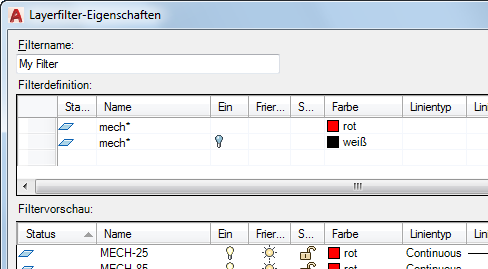 In diesem Beispiel enthält der Layereigenschaftenfilter die Layer, die mit "mech" beginnen und rot sind, oder Layer, die mit "mech" beginnen und deaktiviert und weiß sind.
