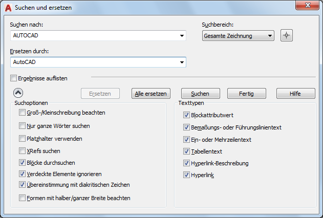 Mithilfe der Einstellung zum Suchen steuern Sie, ob Text in der gesamten Zeichnung oder nur im aktuell ausgewählten Objekt oder in den aktuell ausgewählten Objekten gesucht und ersetzt wird.
