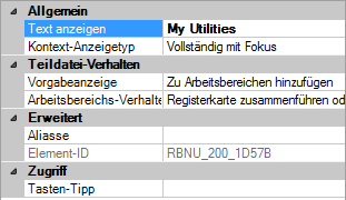 4. Wählen Sie in der Strukturansicht die neue Multifunktionsleisten-Registerkarte aus, und aktualisieren Sie den Bereich Eigenschaften: