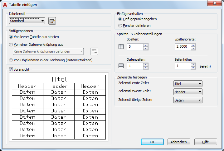 Wählen Sie innerhalb der aktuellen Zeichnung einen Tabellenstil für das Erstellen der Tabelle aus. Sie können einen neuen Tabellenstil erstellen, indem Sie auf die Schaltfläche neben der Dropdown-Liste klicken.