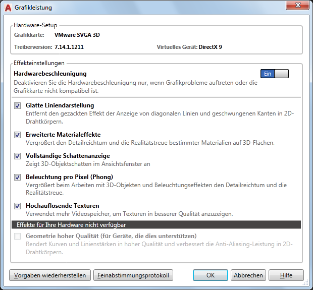- Aktiviert die Verwendung der Hardwarebeschleunigung und ermöglicht die Steuerung aller Effekteinstellungen, die für den aktuellen Treiber verfügbar sind. Bei Deaktivierung ist nur die Option Glatte Liniendarstellung aktiviert.